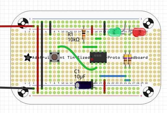 La simulación de mono estable se muestra en la imagen tercera comienza con el LED rojo para indicar que el la salida del 555 es baja. Cuando se presiona el botón el LED verde se encenderá para la cantidad correcta de tiempo. Una segunda pulsación se vuelva a ejecutar la simulación. La simulación puede ser terminada en cualquier momento manteniendo pulsado el botón durante un segundo.