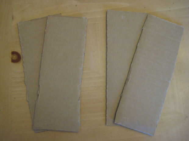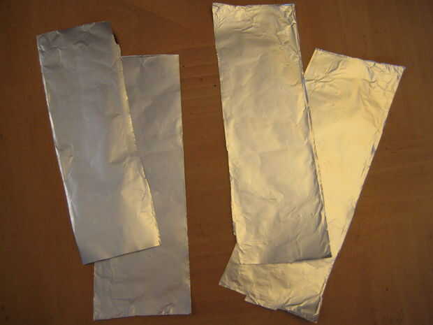Tome la cartulina y cortar las piezas que son de aproximadamente 9" por 4". Se necesitan cuatro de éstos. Corte cuatro hojas de papel de aluminio que son del mismo tamaño que la cartulina, pero aproximadamente 1 el 1/2" más corto. No quiero hacer tan larga como el cartón, porque entonces usted no tendría ningún espacio para pegar.