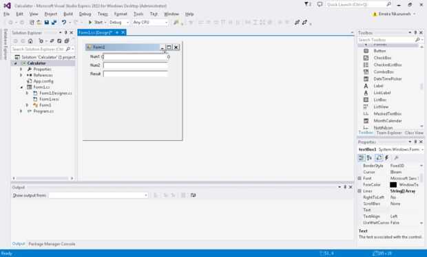 Continuación, vaya a la caja de herramientas y encontrar el cuadro de texto y arrastrar y soltar junto a las etiquetas 3 veces por lo que parece la imagen de arriba. A continuación haga clic en el siguiente en la etiqueta que dice Num1TextBox y luego haga clic en propiedades, desplácese hacia abajo hasta encontrar un cuadro que dice (nombre), haga clic en él y escribir Num1, hacer esto para todos los cuadros de texto según la etiqueta que son a.