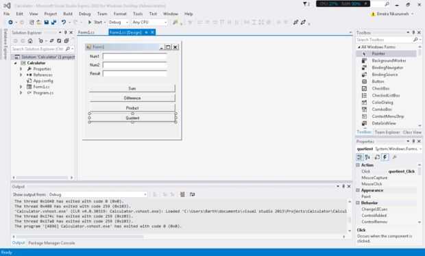 Presione Shift-F7 luego ir a la caja de herramientas y encontrar el botón y arrastre y colóquelo en la pantalla y estirarlo hacia fuera entonces haga clic en ir al cuadro de texto y cambiar lo que dice cociente y luego ir a (nombre) y cociente. Luego haga clic en la ficha con el rayo y haga doble clic en el botón que dice Click va a cambiar la pantalla por lo que vemos líneas de código.