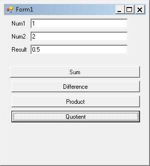 double a, b, c; a = Convert.ToDouble (num1.Text); b = Convert.ToDouble (num2.Text); c = a / b; result.Text = c.ToString ();