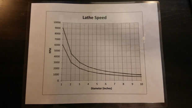 La velocidad adecuada para el torno de madera puede calcularse basándose en el diámetro de la pieza de giro. Cuando multiplicas el diámetro de la madera en pulgadas por el RPM del torno el número debe estar entre 6000 y 9000. He creado un gráfico para ayudar a visualizar la relación diámetro y velocidad.