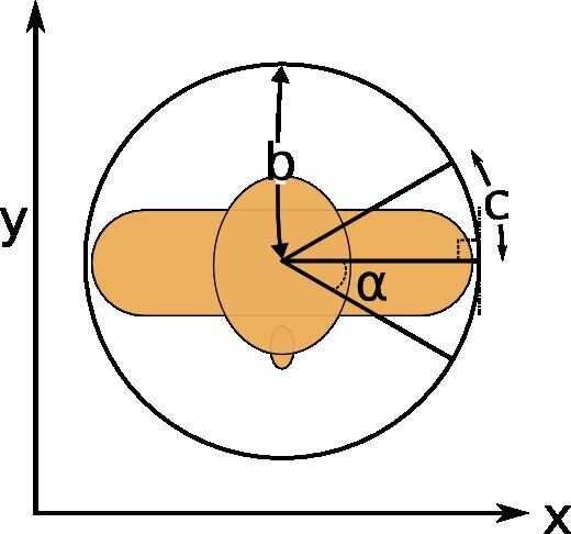 La imagen es una vista superior de una persona y la esfera que los cubre. Puesto que esto no es una imagen 3D, pero una proyección 2D, no se puede apreciar la perspectiva. c es en la parte inferior de la esfera mientras que α es en la parte superior.