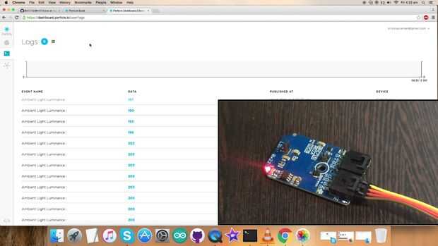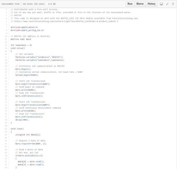 #include<application.h>#include<spark_wiring_i2c.h>// BH1715 I2C address is 0x23(35)#define Addr 0x23 int luminance = 0;void setup(){ // Set variable Particle.variable("i2cdevice","BH1715"); Particle.variable("luminance",luminance); // Initialise I2C communication as MASTER Wire.begin(); // Initialise serial communication, set baud rate = 9600 Serial.begin(9600); // Start I2C Transmission Wire.beginTransmission(Addr); // Send power on command Wire.write(0x01); // Stop I2C Transmission Wire.endTransmission(); // Start I2C Transmission Wire.beginTransmission(Addr); // Send continuous measurement command Wire.write(0x10); // Stop I2C Transmission Wire.endTransmission(); delay(300); } void loop(){ unsigned int data[2]; // Request 2 byte of data Wire.requestFrom(Addr, 2);// Read 2 bytes of data // ALS msb, ALS lsb if(Wire.available()==2) { data[0] = Wire.read(); data[1] = Wire.read(); } delay(300); // Convert the data luminance = ((data[0] & 0xFF) * 256 + (data[1] & 0xFF)) / 1.20; // Output data to dashboard Particle.publish("Ambient Light Luminance :", String(luminance));}