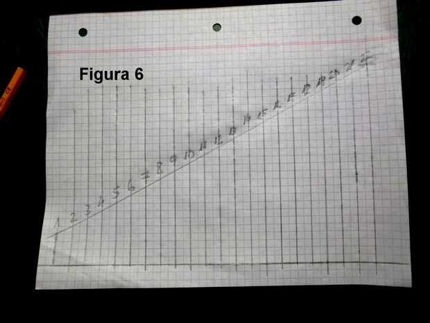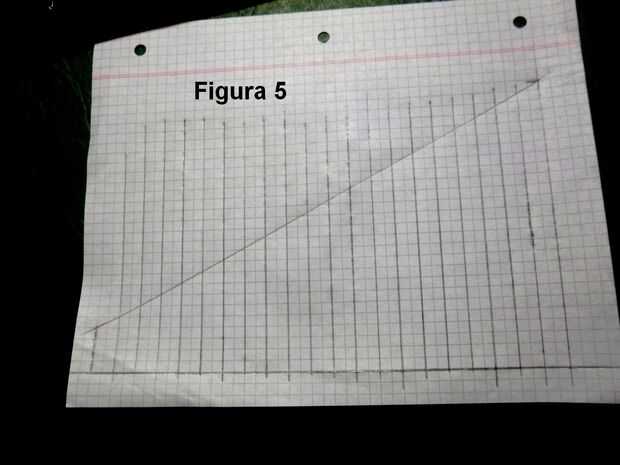 Trazamos una línea inclinada pase por ambos puntos. Esta línea representará, en las intersecciones con las líneas verticales, los radios de las distintas posibles de poleas (Fig. 5).