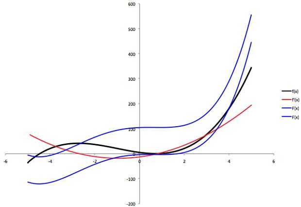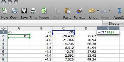 En la celda F1 escriba "= SUM($E$1:E1)" y arrastra la celda hacia abajo. Lo que está haciendo es sumar todos los rectángulos de célula uno a celular x. Esta es la integral indefinida. Seguir adelante y ver en su parcela. Integrales todos están relacionados por una constante. Si hubiera escrito en "= SUM ($E$ 1: E1) + 200" en el último paso en su lugar, todavía sería la integral que buscas. No importa qué constante se utiliza.