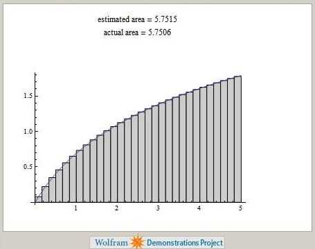 Estamos encontrando la zona utilizando un método de aproximación conocida como sumas de Riemann. Básicamente estamos dibujando un montón de rectángulos que se aproximan a la forma de nuestra curva. Si sumamos el área de cada rectángulo, sabemos (más o menos) el área bajo la curva. La imagen de abajo vale 1 mil palabras.