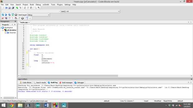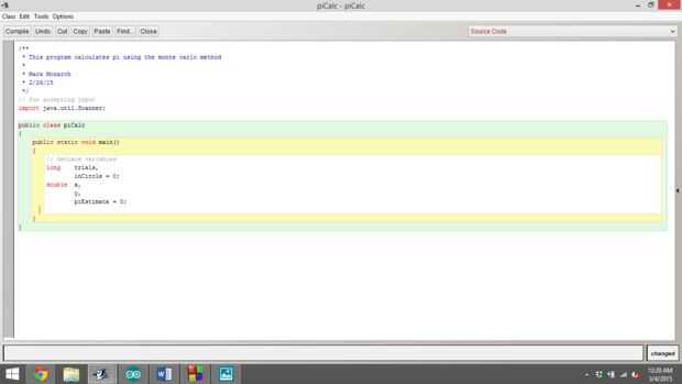 Para completar este programa, usted necesitará las variables para el número de ensayos, el número de ensayos en el círculo y la estimación de pi. He incluido otras variables que representan x e y coordenadas con el fin de hacer más fácilmente comprensible. La variable de número en el círculo debe establecerse igual a cero, todos los demás se tratarán más adelante.