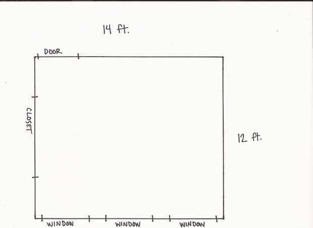 Su cliente quiere que pintó el dormitorio de su hijo. La habitación es 12 pies de ancho x 14 pies largo con una altura de techo de 9 pies. En la sala, hay una puerta 3 pies de ancho x 7 pies de altura, una puerta del armario 6 pies ancho x 7 pies de altura, y tres ventanas 3,5 pies de ancho x 4,5 pies de largo. Tendrá dos capas de pintura para cubrir las paredes. Cada galón de pintura cubre 350 pies cuadrados.