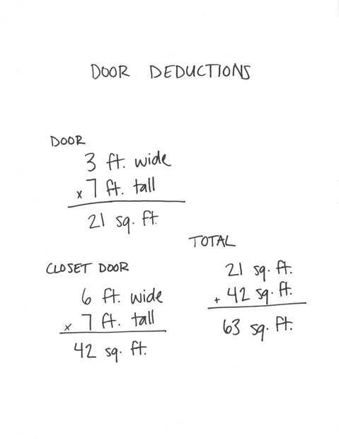 Deducciones de la puerta: multiplicar la altura y la anchura de cada puerta en la habitación (la puerta y la puerta del armario) y sumar.