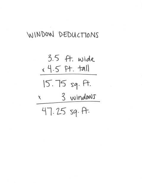 Deducciones de la ventana: multiplicar la altura y la anchura de una ventana. Porque todas las ventanas son del mismo tamaño, y hay 3 de ellos en la habitación, multiplique por 3.