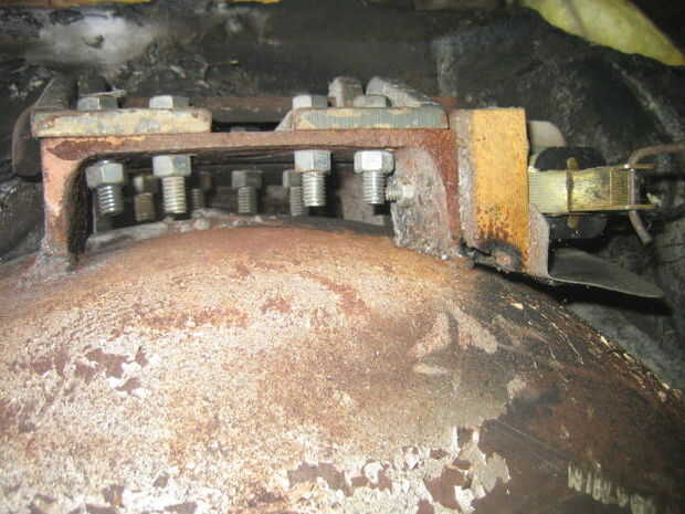 necesitamos una bisagra para la puerta. Soldado con autógena en un poco corto de hierro canal a darme una superficie plana para las bisagras. uno en el fuego, uno en la puerta. En mi primera caldera tuve algunas bisagras confeccionadas en la caja de basura. eso es lo que muestran las fotos. para éste, necesito hacer algo similar de hierro ángulo pesado. Desea las bisagras del perno en así que se pueden ajustar. mientras estamos en eso, perfore un orificio de 1/4" en la parte inferior del canal en la puerta. Esto mantendrá el solonoid.