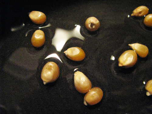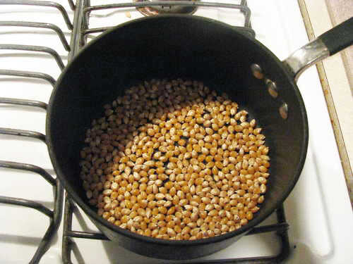 Agregar aceite vegetal a la olla lo suficiente por lo que sale a mitad de camino en los granos. Ponga la tapa en y girar a la llama a medio.