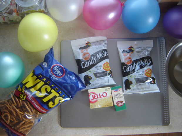 -Chocolate o caramelo se deshace de su elección (para la mina usaba Wilton medianoche negro caramelo se derrite como estaban más cercanos al color de un caldero que brown) -Globos -Pudín instantáneo vainilla -Leche -Verde (o cualquier color usted quiere que su poción que) colorante -Pretzels -Galletas -Papel de cera o una silicona hornear
