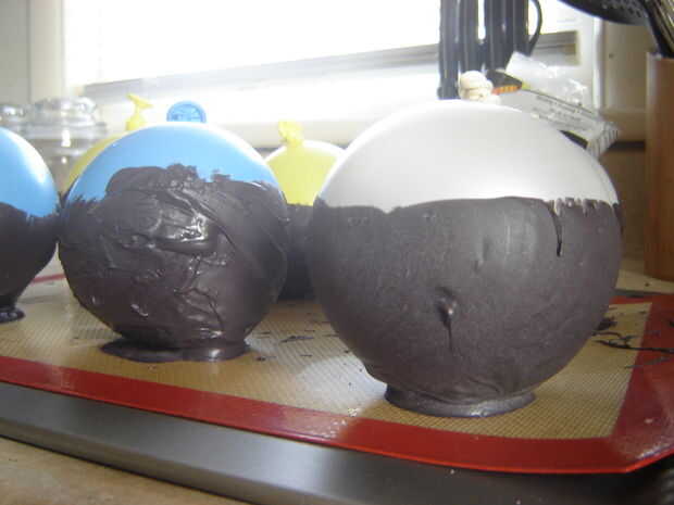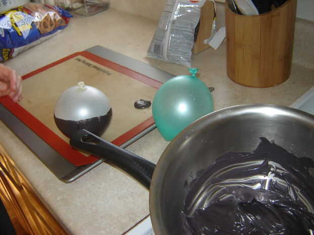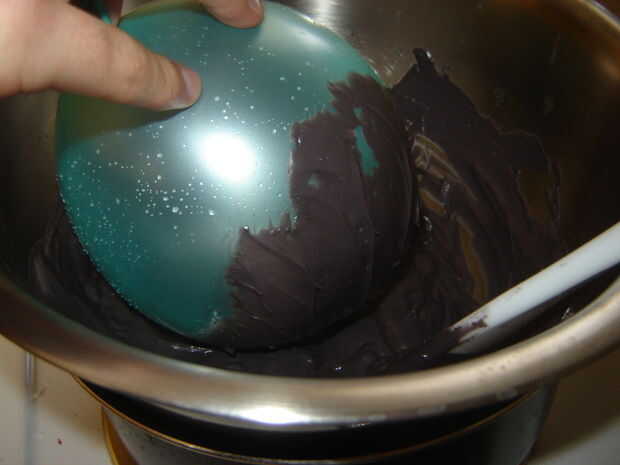 Cuando el caramelo se derrite apenas a la derecha, tomar una cucharada de la misma y colóquela en la bandeja para hornear galletas con papel de cera o silicona bandeja para hornear; Esto se convertirá en la base del caldero para que está parado en su el propios. Cuidadosamente sumerja el globo en el caramelo, tratando de cubrir la parte inferior la mitad de ella tan uniformemente como sea posible. Coloque el globo sumergido en el chocolate que cucharea sobre la hoja. Seguir haciendo estos pasos hasta que todos tus globos han sido sumergidos.