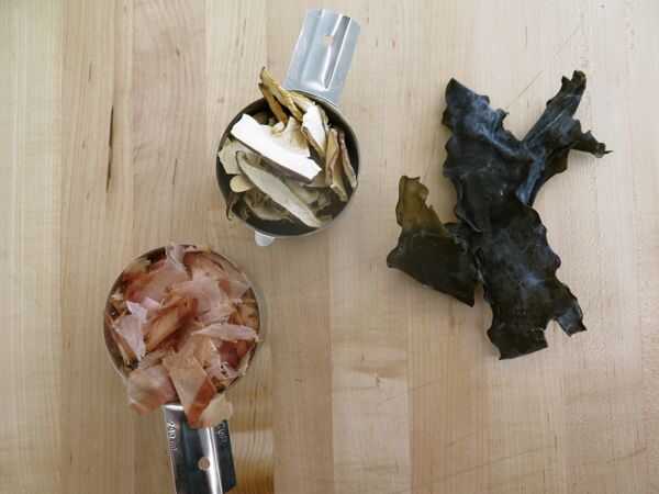 Utilizar 1 trozo de kombu de 2 pulgadas de ancho y 4-6. Medir una taza de escamas de bonita y 3/4 taza de setas shitake secos, troceados.