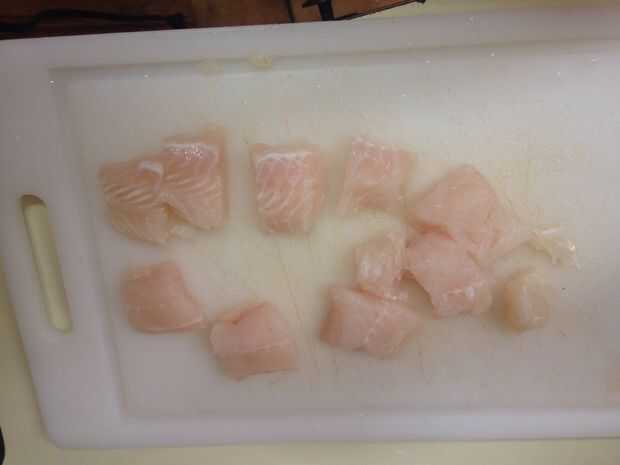 2 libras de pescado en cubos de 2 pulgadas y agregar a la olla hirvienda.