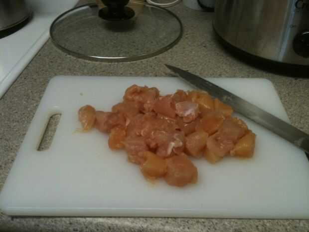 A continuación cortar el pollo en cuadritos y luego colóquelo en una cacerola de agua hirviendo. Aquí solo quiero cocinar el pollo lo suficiente como para que ya no es totalmente cruda. También podría asar u hornear el pollo antes de mano si es de su preferencia. Después de hervir I vaciar el pollo y añadimos a la olla.