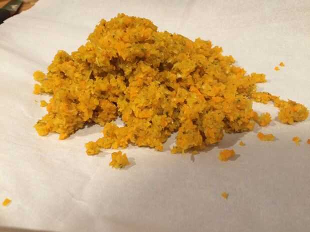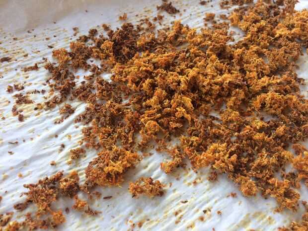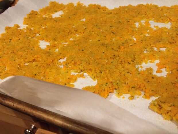 Transferir las verduras cocidas a una bandeja para hornear forrada pergamino y use una espátula para extender como fino como sea posible, no más gruesa que 1/8 de pulgada. Hornee a 250F durante 90-120 minutos, revolviendo cada 30 minutos, o hasta que las verduras apenas oscureció un poco y seque totalmente.