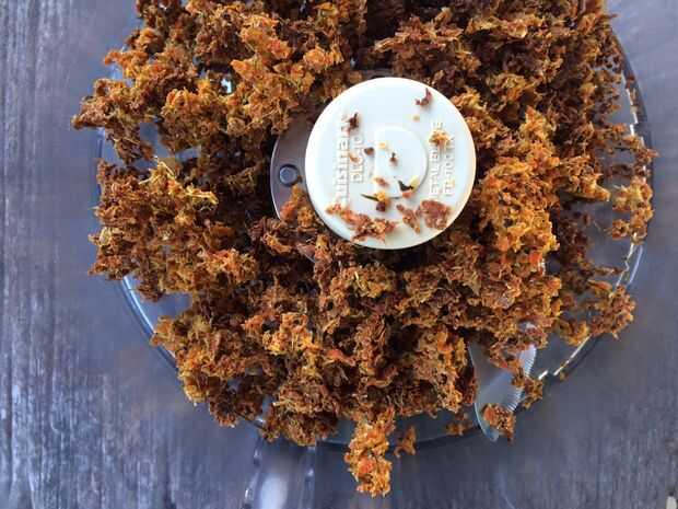 Transferir las legumbres a una licuadora, molinillo de café o procesador de alimentos y pulse hasta que se forme un polvo y poco sin pedazos visibles existen. Esto tomó cerca de 30 segundos para mi lote.