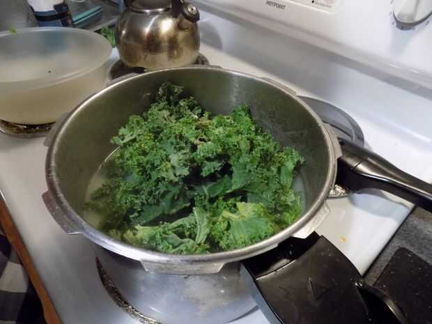 Añadir la col a la olla junto con un cubo de caldo y dejarlo regresar a fuego lento. Dejar cocer a fuego lento unos 20 minutos.