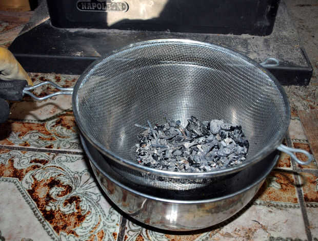 A continuación probablemente va a ser la cosa más controvertida. Tome un colador de malla metálica y las cenizas del filtro. Mayoría de la gente no haría esto pero tengo varias razones por qué lo hago.