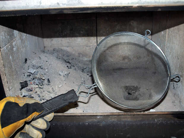 Cuando el fuego se haya enfriado lo suficiente como para trabajar con empezar empujando las cenizas a un lado. Por el camino seguirá siendo caliente así que use guantes para evitar quemaduras.