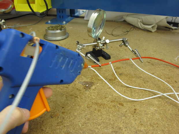 Un gluegun caliente funciona muy bien para aislar las conexiones de soldadura y reforzarlos para que el alambre expuesto no dobla abruptamente que podría hacer que se rompa con el tiempo.