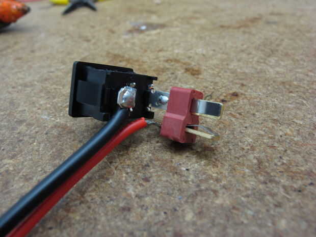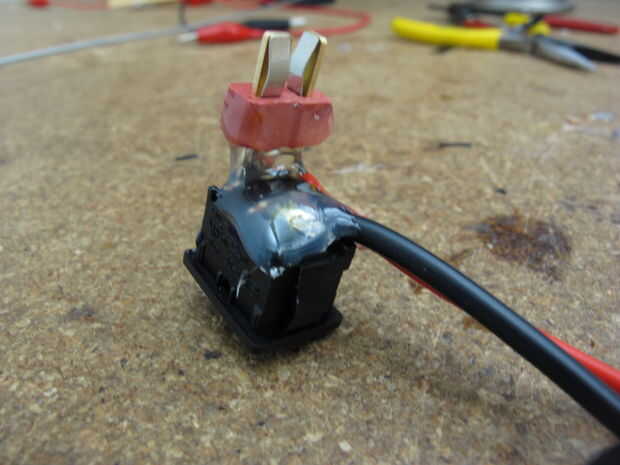 Cualquier interruptor de haría, en la imagen arriba un pequeño interruptor fue soldado directamente a la clavija de la batería para ahorrar espacio, reforzado y aislado con pegamento caliente.
