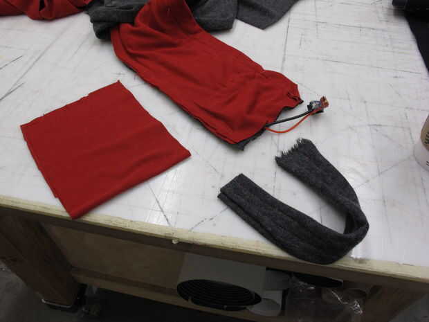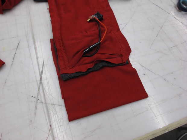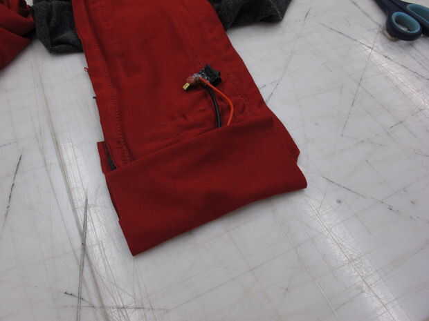 Hemos añadido un circuito para mejorar la función de costura para el mismo lado, aún teniendo cuidado de no coser sobre los cables. El rectángulo es doblado sobre y cosido por los lados otra vez.