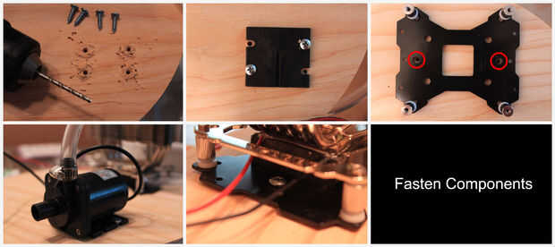 Guía-agujeros del taladro en la madera para los tornillos de metal; en este caso #8 x 5/8" tornillos fueron utilizados. A continuación fije el disipador de calor posterior bomba y placa de soporte a la madera con los tornillos.