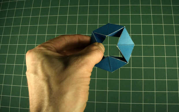 Suavemente sujetan la kaliedocycle: esta es una etapa crítica! En los próximos varios minutos, lentamente flex esta última articulación hacia adentro y hacia afuera, poco a poco. Como se hace esto, asegúrese de que también tienes el anillo juntos.