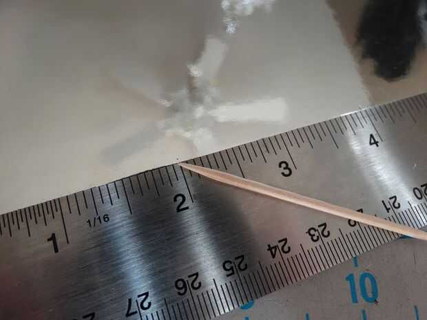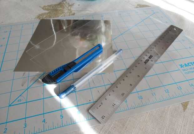 Marcar rectángulos idénticos 3. Si no quiere manchar su acabado espejo con una herramienta de escritura, puede hacer sus marcas por abollar la lámina con una punta de palillo de dientes en su lugar. Mi rectángulos miden 2 x 7 pulgadas, altura suficiente para dar cabida a mis ojos y suficiente longitud para dar la sala de efectos visuales para vagar.