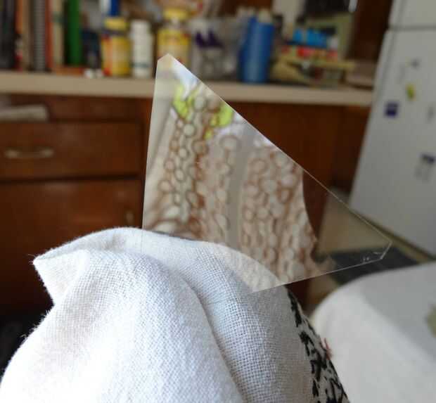 Usando la toalla de algodón plato otra vez, dar a ambos lados de un triángulo de acetato una buena frotación. Si hay grasa terca, puede utilizar unas gotas de limpiacristales. No use toallas de papel que puedan rayar la superficie del acetato. Esta pieza debe ser huella digital libre antes de la instalación.