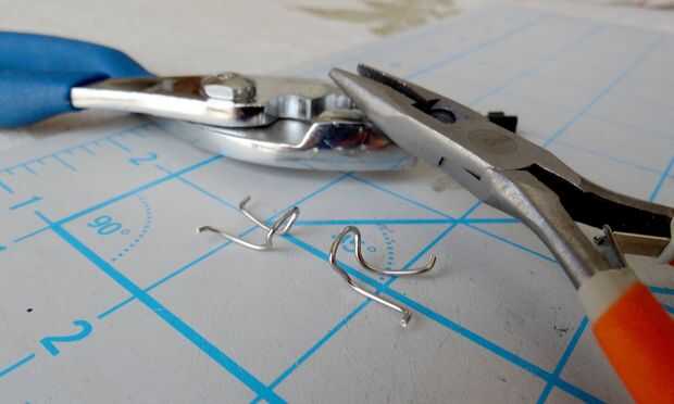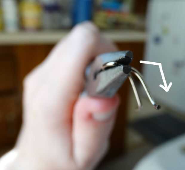 Alicate para doblar las piernas de la pieza de alambre de la cabeza. En cualquier lugar entre un 45 y 90 grados ángulo hará. Este cable es difícil, así que usted puede encontrar que necesita para sostener la cabeza con un juego de alicates y luego doblar con un par de opuestos.