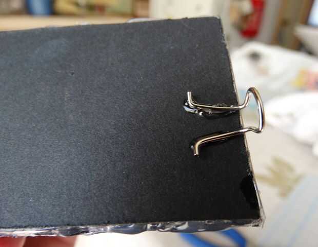 E-6000 de aplicar a las piernas de la pieza de alambre y presione en su lugar. La cabeza del alambre debe quedar hacia arriba y lejos del tubo del triángulo.