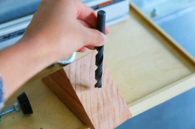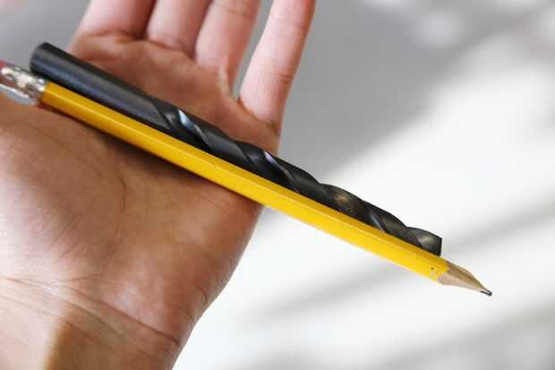Agarré una broca que era ligeramente más grande que el diámetro de un lápiz No.2 estándar. Perforar hacia abajo para crear un agujero piloto para mi lápiz. Dejé la broca apenas tímido de la parte inferior de la cubierta para que el lápiz sea capaz de descansar en lugar de caer a través. ¿Quién quiere una chimenea cayendo? ¡ No yo!
