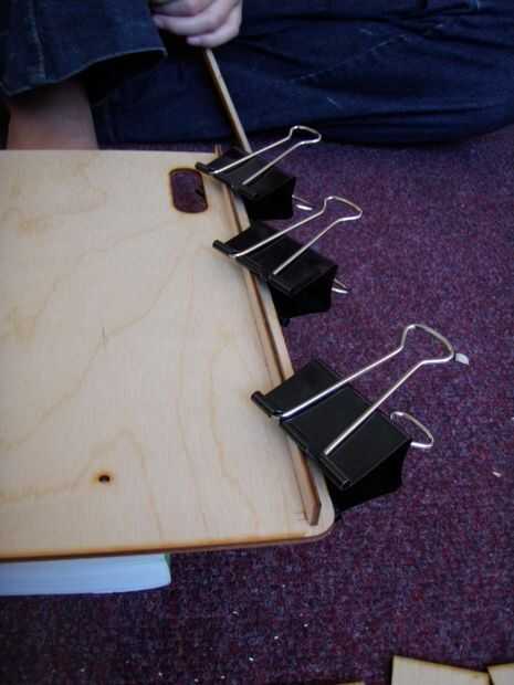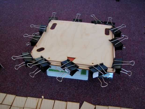 Asegúrese de que cada pared es exactamente cuadrado verticalmente y alineado con las guías. Organizar un libro o algo que permite la tabla para colocarse en la parte superior con sus bordes libremente accesible todo. Luego utilizar una serie de clips de foldback para apretar las paredes en la posición correcta. Si permite que los clips de foldback para realmente apoyar el peso del tablero, se doblan hacia adentro un poco, las paredes consiguen torcidas y secarán torcidas. Si el tablero está en un libro, el foldback clips en espacio libre y pueden presionar perfectamente vertical uniformemente a lo largo de la longitud de la pared - realmente ayuda a escuadra y adherencia.