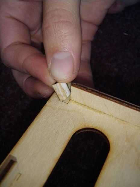 Antes de pegar las paredes en su lugar, busque la sección más pequeña de la pared, que se adapta a la esquina inferior derecha de la placa de respaldo. Utilice el cuchillo para chaflán/bisel forma redondeada en la esquina frente a interior para que paneles de semana nuevo asiento fácilmente después de caer en el agujero de entrada.