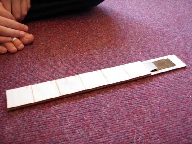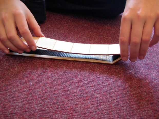 Se aplica presión deslizante a lo largo de la parte posterior de la cinta de conducto inicialmente pegar los azulejos. Doblar 6 de los azulejos sobre en la parte superior, dejando 8 a continuación y una mitad-ficha de la cinta expuesta hacia arriba. Volver a plegar el azulejo 8 en la fila inferior y fije la cinta expuesta, comprobando la estrecha alineación de la ficha 6 en la parte superior, para completar el bucle.