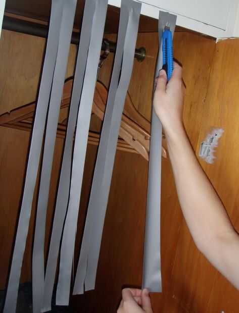 La cinta de conducto que me he encontrado es demasiado ancha para los azulejos, así que usar el cuchillo con la cinta colgando hacia abajo de una jamba de la puerta para cortar en dos trozos de media anchura.