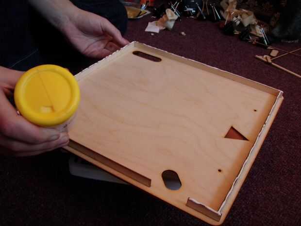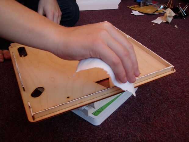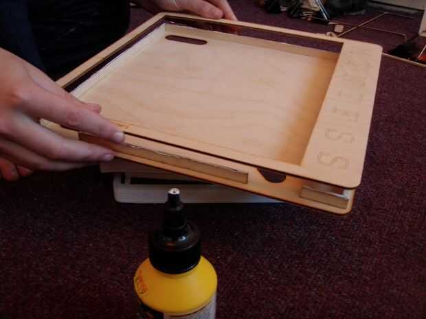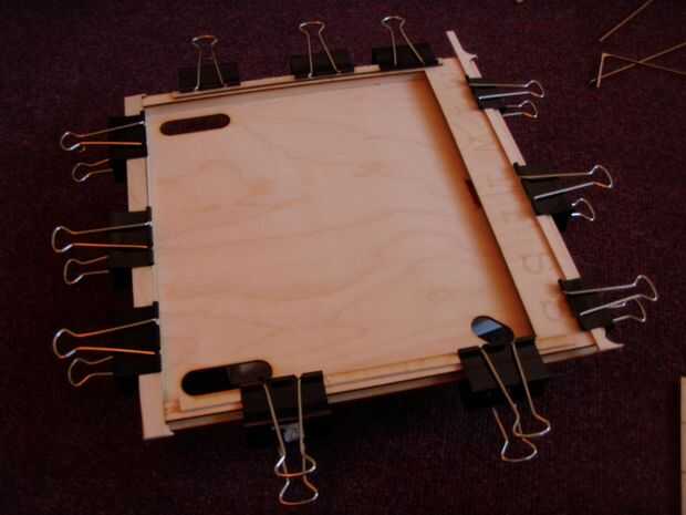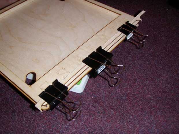 Alinee la placa de modo que la pared inferior quede al ras con el borde interno de la placa de la cara - no labio es necesaria en el frente como los paneles de la semana se conservan en la ranura izquierda y derecha. Si tiene un borde cuadrado utilizar para verificar la alineación entre la parte superior e inferior. Tiene exactamente el mismo esquema que la placa base, por lo que se puede juzgar más o menos por el ojo de encima. El calendario de la abrazadera como antes. Si usas foldback clips o abrazaderas desprotegidas al presionar la articulación pegamento entonces puede que desee proteger la placa con algún material de desecho para que no marque.