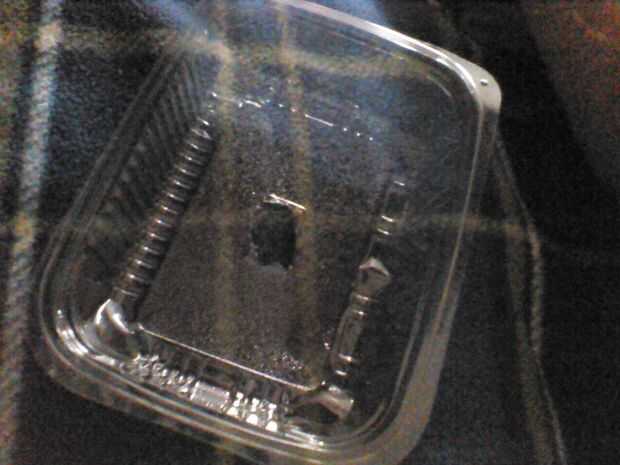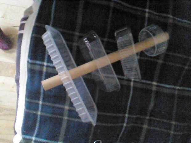 Para crear el esqueleto, uso el par de tijeras para hacer un agujero en el centro de cada recipiente de plástico, tan grande como el rodillo de cartón está usando (ver imagen).