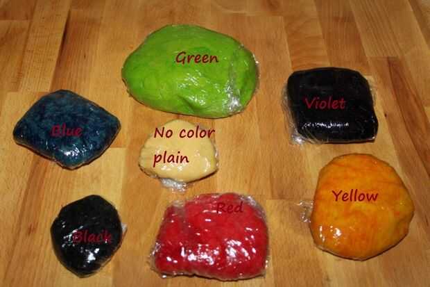 Dividir la masa en la parte 7. Depende de Cuántos colores quieres utilizar. Si desea añadir más colores y luego dividirlo en la cantidad requerida de parte. Para la base de una gran cantidad y para el resto de los colores depende de usted. Acabo de hacer en pequeñas porciones.