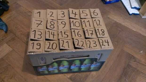 Mi cajón de cerveza tenía unos agujeros en los lados para bien de la decoración que permita llevar. Como no quería permitir picos en el interior, estos agujeros estaban cubiertos con un cartón más. Esto también le da un gran lienzo para decorar el calendario de Adviento con un arte exquisito hecho a sí mismo :)