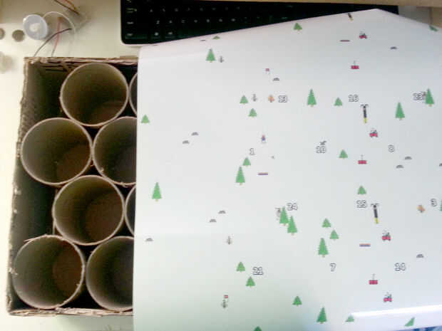 Cuidadosamente Alinee los marcadores de impresión (como se ve en el paso 4 - mina fueron los árboles muertos) con las esquinas de la caja y suavemente presione en su lugar. Desde tubos de cartón cortados tenían alguna variación que el cartel no se sientan perfectamente plana. Coloqué algunas toallas pesadas sobre la cubierta para el peso y que el pegamento seque por completo.