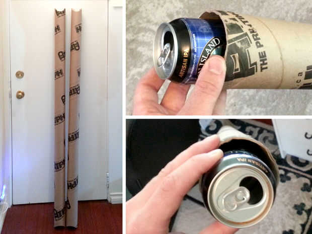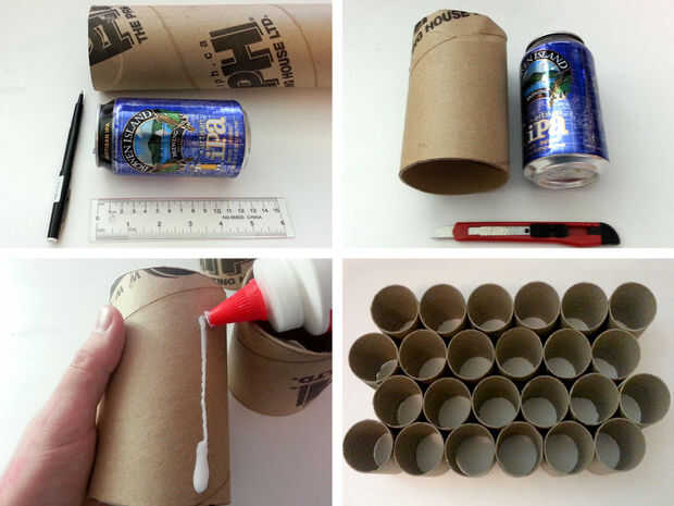 Latas de bebidas en América del norte son típicamente 4.5" de alto x 2.4" diámetro. Mis tubos eran aproximadamente 3" de diámetro, y cada tubo fue cortado en secciones largas de 5" con un cuchillo de la manía aguda. Con mi 2 tubos tenía suficiente para 24 partes iguales y tenía dos pequeñas porciones restantes que fueron pegadas para hacer 25 secciones de tubo uniformemente alta.