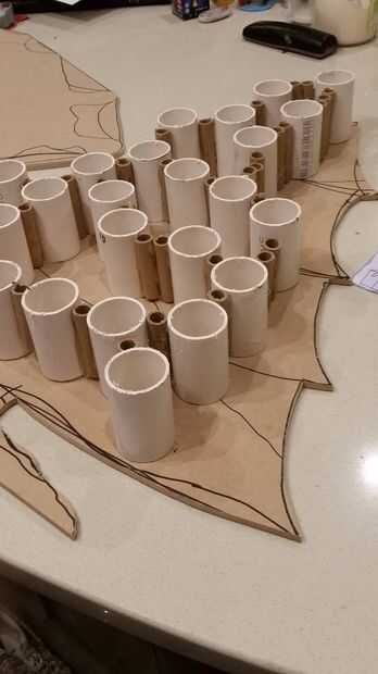 Establecer el conjunto de tubo con "Back" en el MDF de 5mm y luego trazar alrededor de los tubos lo más cerca posible. Esto es para formar la parte de atrás. Corte y marque el MDF con "back" para saber qué lado cuando pones volver juntos más adelante.