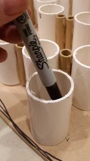 Usa tu sharpie, trace una línea alrededor del interior del tubo de 40mm para marcar donde debe cortar los agujeros en el árbol. Tenga cuidado de no mover la Asamblea como usted traza.