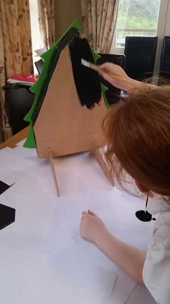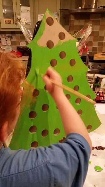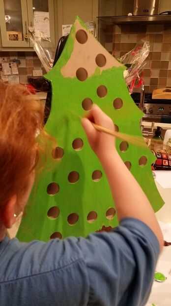 Usando la pintura pintura de cartel verde del árbol. Mina tiene un tronco y un pedazo de tierra cubierto de nieve. Así que pintamos este marrón y blanco respectivamente.